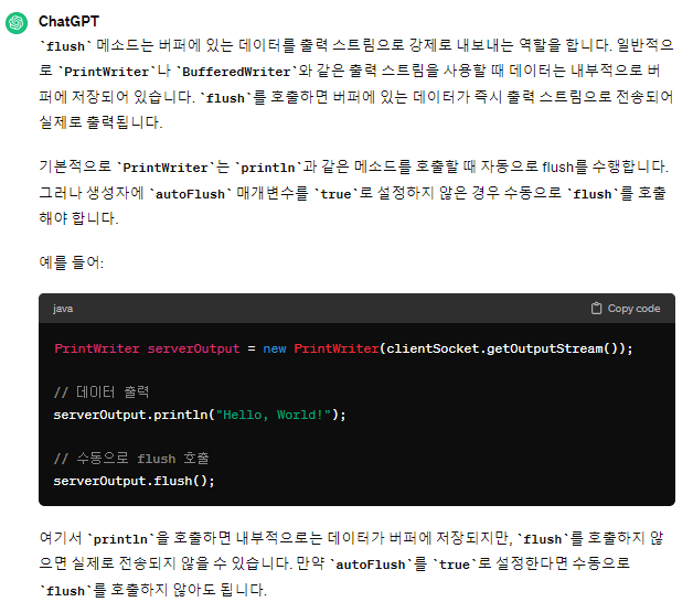 | 선언 PrintWriter out = new PrintWriter(socket.getOutputStream()); out.println(outputMessage); out.flush(); |