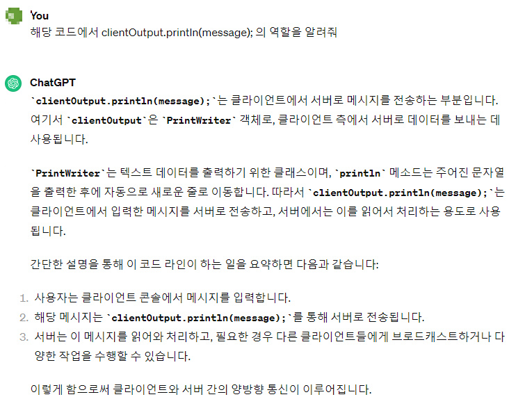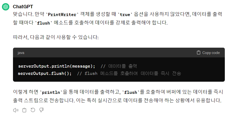 | 선언 PrintWriter out = new PrintWriter(socket.getOutputStream()); out.println(outputMessage); out.flush(); |
