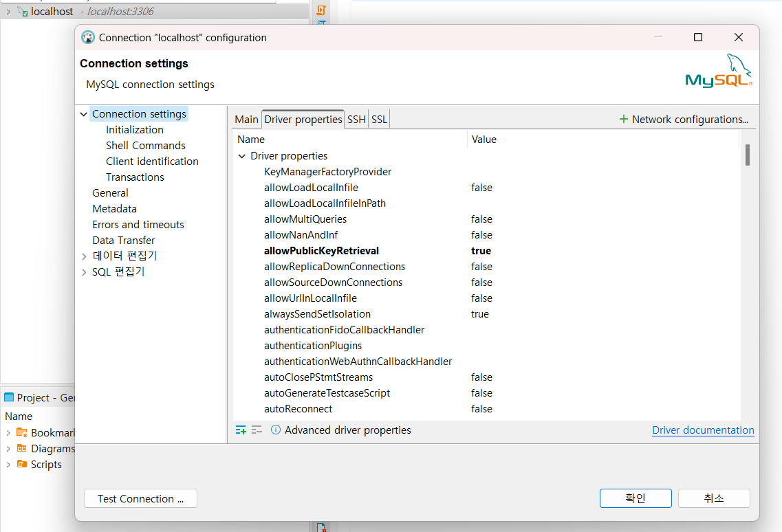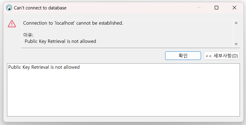 DBeaver(디비버) Public Key Retrieval is not allowed 에러 디비버에서 MySQL 데이터베이스 접속을 잘하다가 갑자기 Public Key Retrieval is not allowed 에러를 만났다. MySQL의 8.x 버전 이후부터 발생하는 문제라고 한