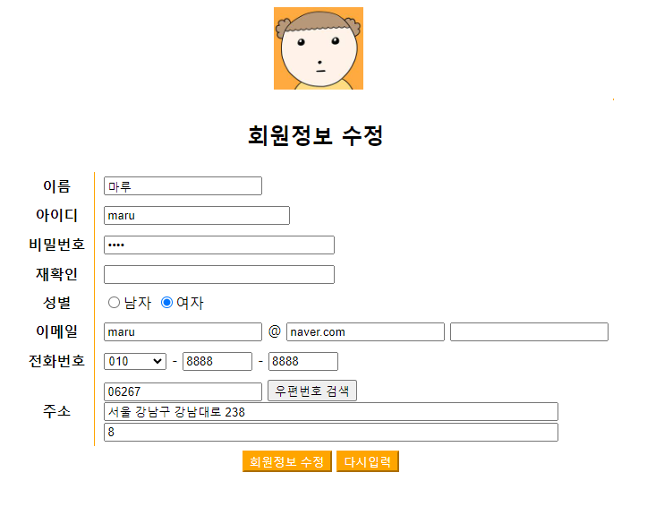 비밀번호랑 재확인 비밀번호가 동일한 경우에만 회원정보 수정이 가능하다. 그 이후, index.jsp 화면으로 이동한다.