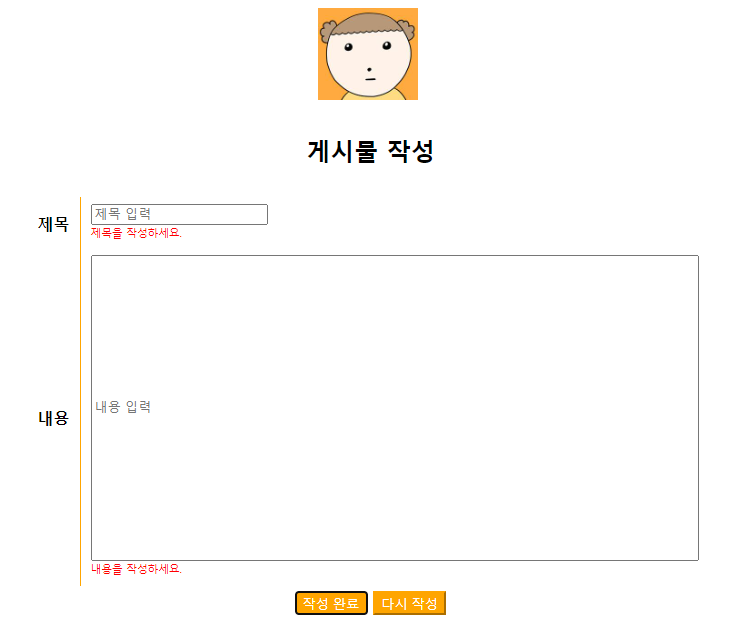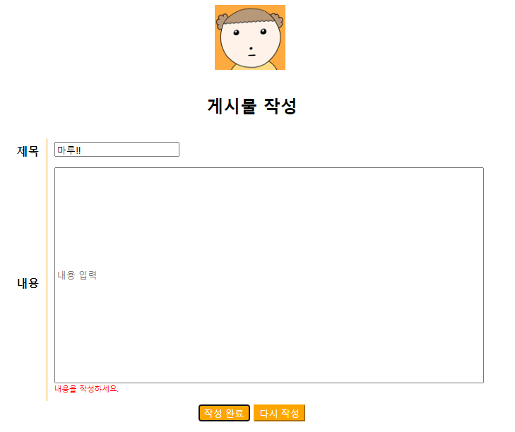 제목 혹은 내용을 작성하지 않을 시, 데이터가 서버로 넘어가지 않으며, 작성해달라는 문구가 아래 발생된다.