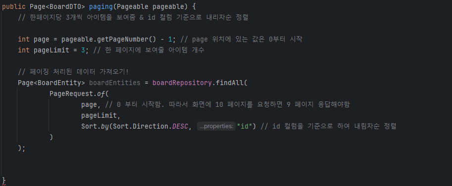 -> page 위치에 있는 값은 0부터 시작함. 따라서 10 페이지를 요청하면 9 페이지로 데이터를 찾아야함.