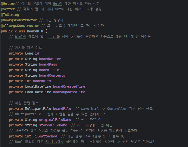 클라에서 전달한 데이터를 DTO 객체로 받기때문에 해당 클래스에 파일 관련 변수 초기화