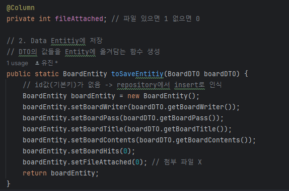 1. 객체 변환 : DTO -> Entity (setFileAttached= 0)