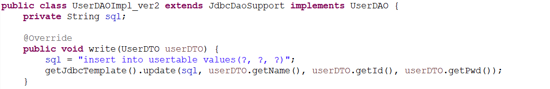 jdbcTemplate.update(sql, userDTO.getName(), userDTO.getId(), userDTO.getPwd());