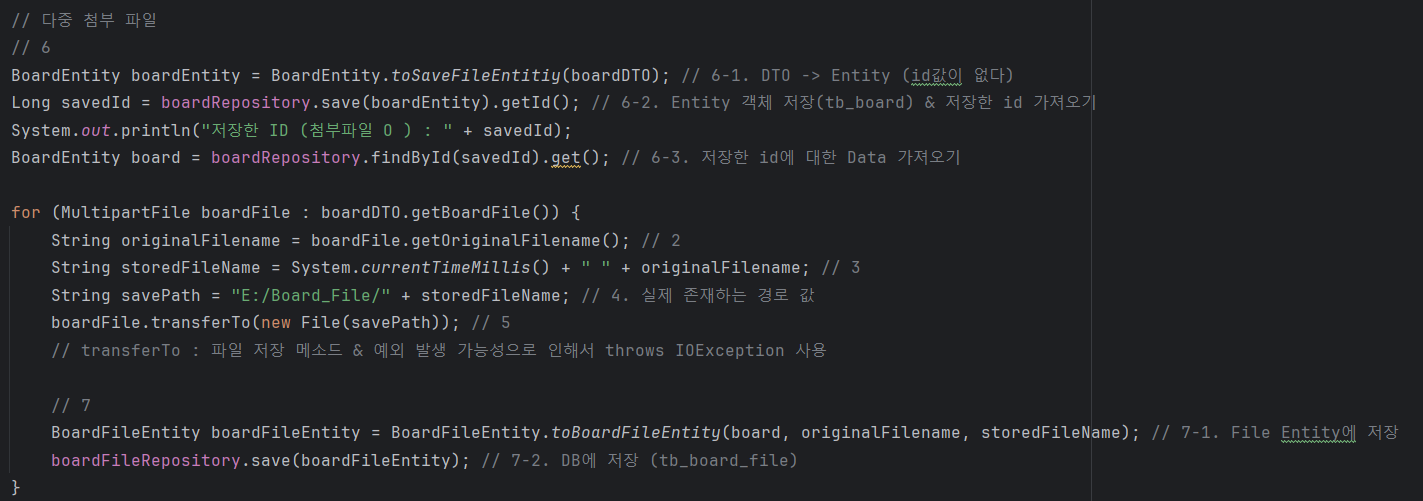 BoardFileEntity boardFileEntity = BoardFileEntity.toBoardFileEntity(board, originalFilename, storedFileName); // 7-1. File Entity에 저장