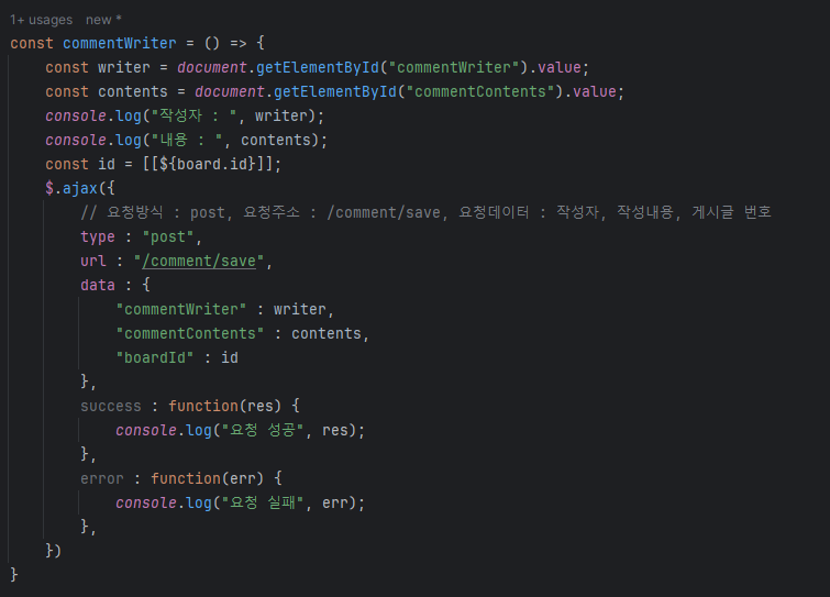 - comment : commentContents(태그 id)에 대한 값을 가져와 변수에 저장