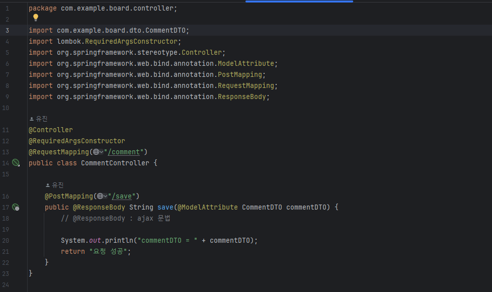 2. @ModelAttribute 어노테이션을 사용하여 commentDTO로 데이터 받음