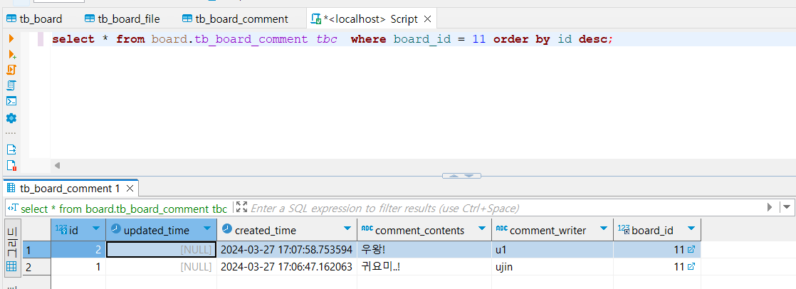 SQL문 : select * from tb_board_comment where board_id = ? order by id desc;