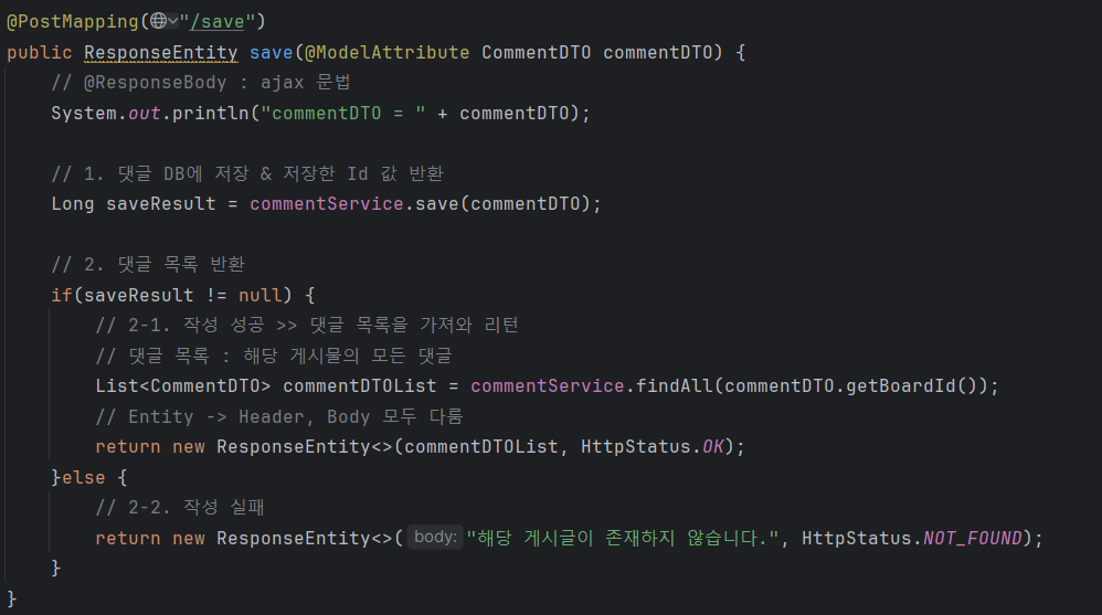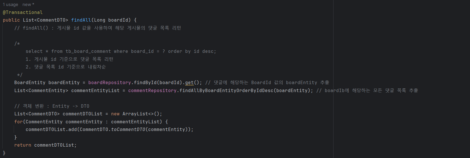 - commentEntityList : tb_board_comment(DB Table)에서 boardId에 해당하는 모든 댓글 Row Data 추출 & 내림차순 정렬