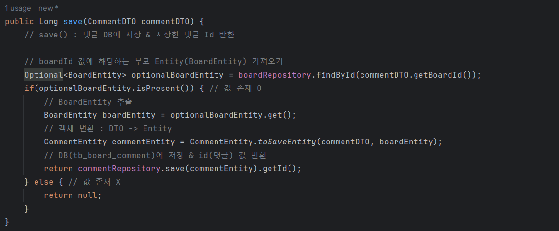 - 반환 : tb_board_comment 테이블에 저장(DB 저장) & 댓글 Id 값