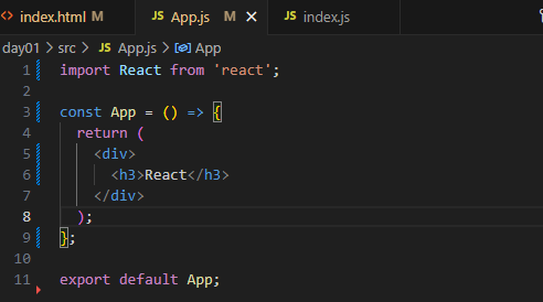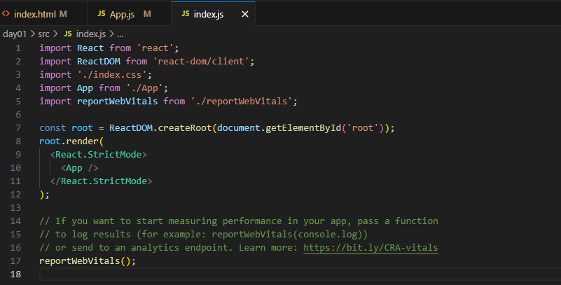 2. index.js 에서 id가 root인 태그에 App.js 파일에 있는 App 함수 반환값을 그려라