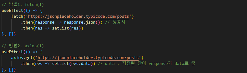 - 외부 API 비동기 통신을 위해서 fetch()를 이용한다.