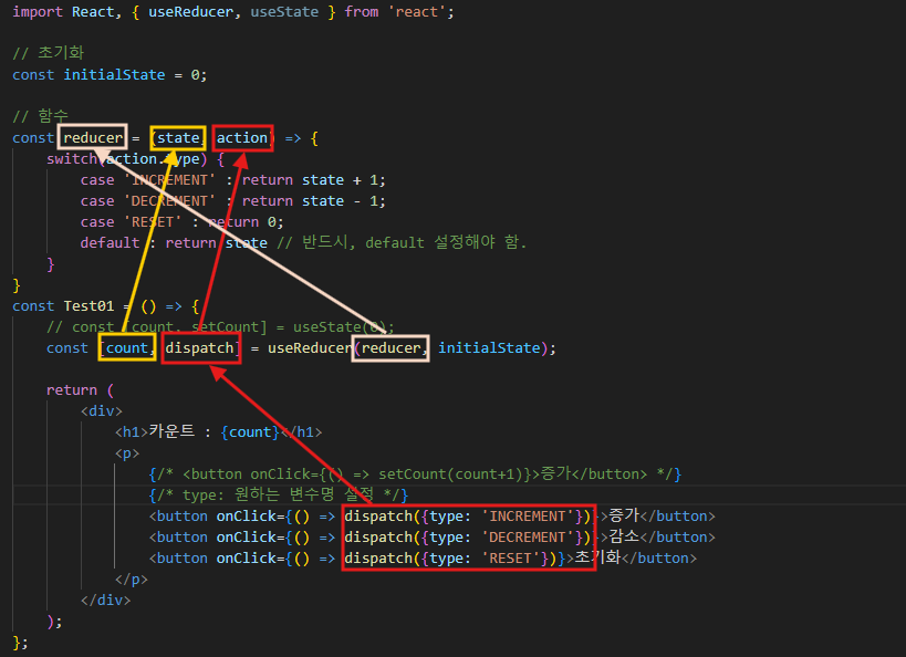 - reducer : state와 action를 받아 새로운 state를 반환하는 함수
