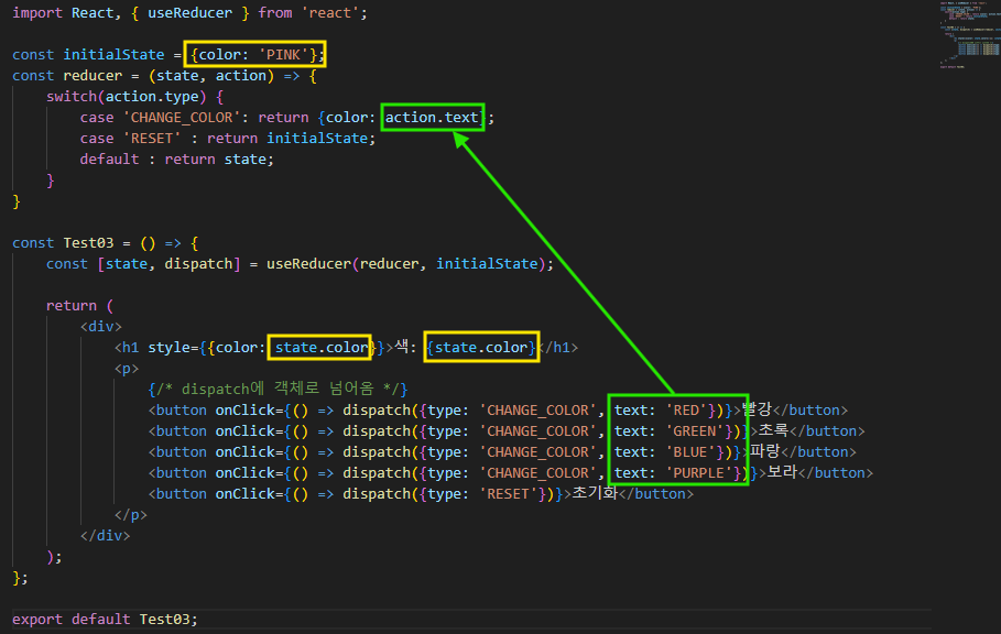 초록색: type 변수가 CHANGE_COLOR일 경우, text 변수에 따른 값 변화