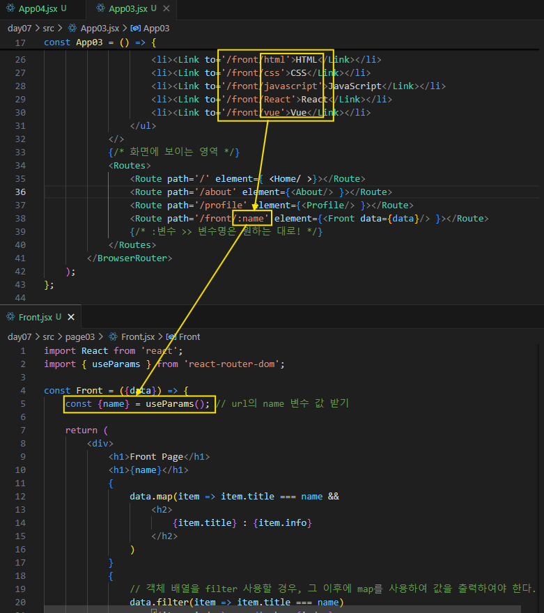 : 뒤에 나오는 부분이 params의 key 부분이 되어 :name 는 name가 key가 되어 불러오고 있다.