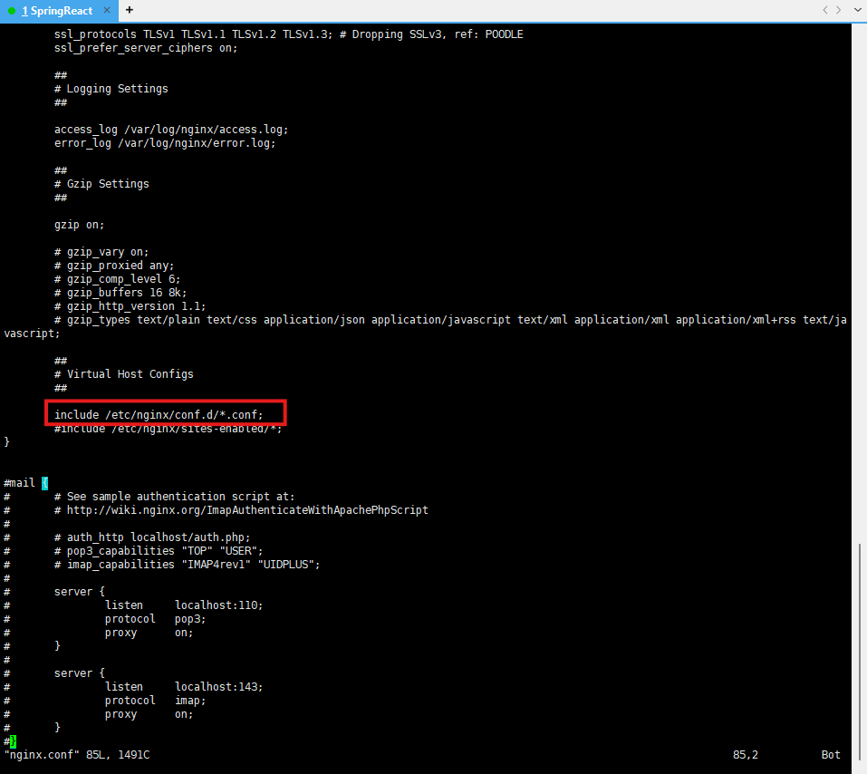 메인 환경 설정 파일에 nginx가 읽어올 수 있는 환경 설정 파일에 대한 정보 확인