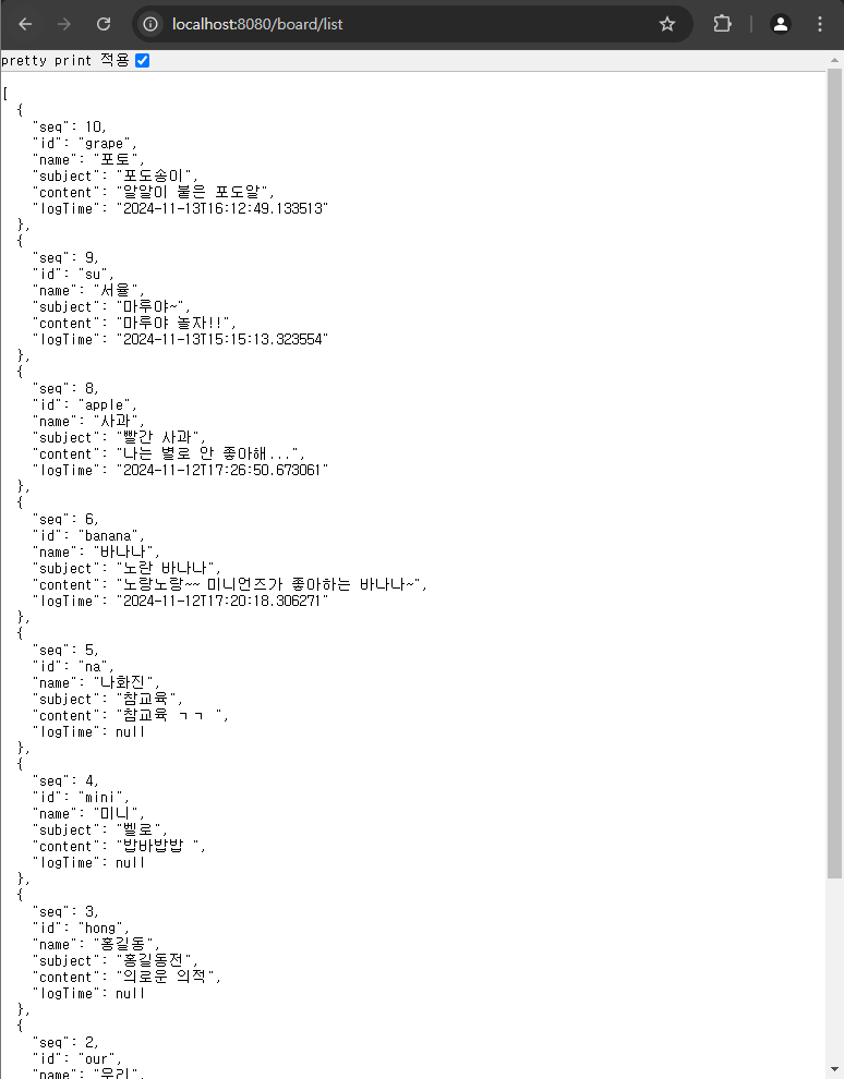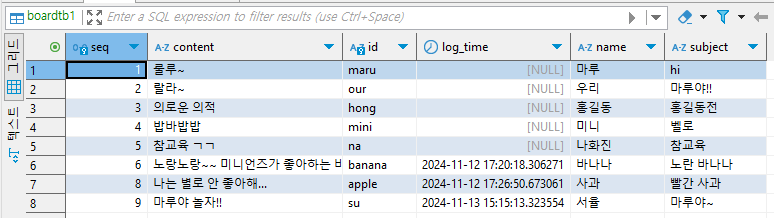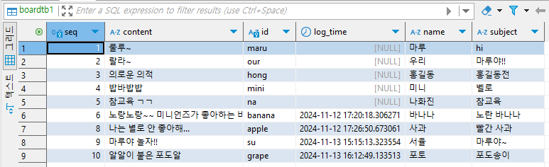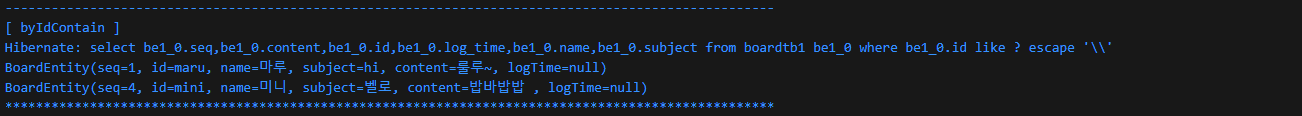 목적: id컬럼의 값이 String 값을 포함하는 데이터 검색