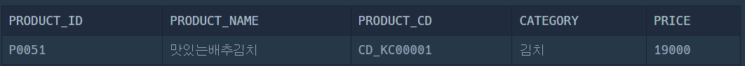 SELECT PRODUCT_ID, PRODUCT_NAME, PRODUCT_CD, CATEGORY, PRICE