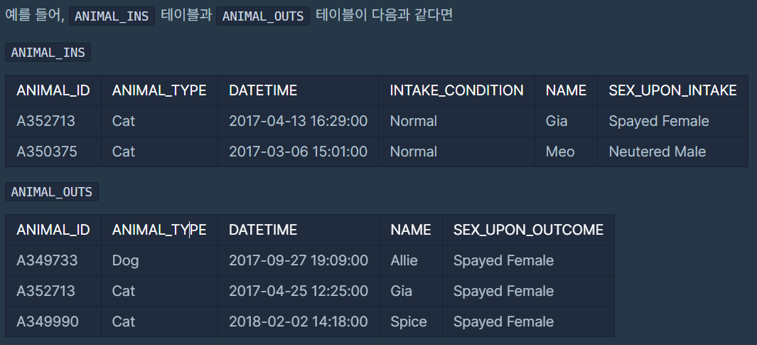 left join ANIMAL_INS on ANIMAL_OUTS.ANIMAL_ID = ANIMAL_INS.ANIMAL_ID