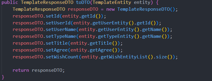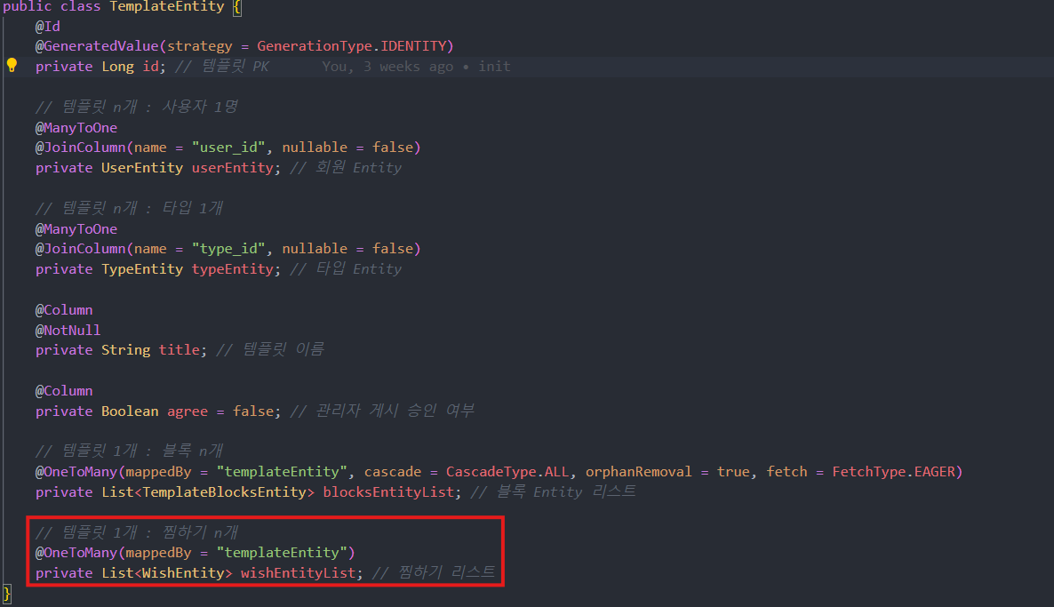 그래서 TemplateEntity에 List<WishEntity>에 추가했다.