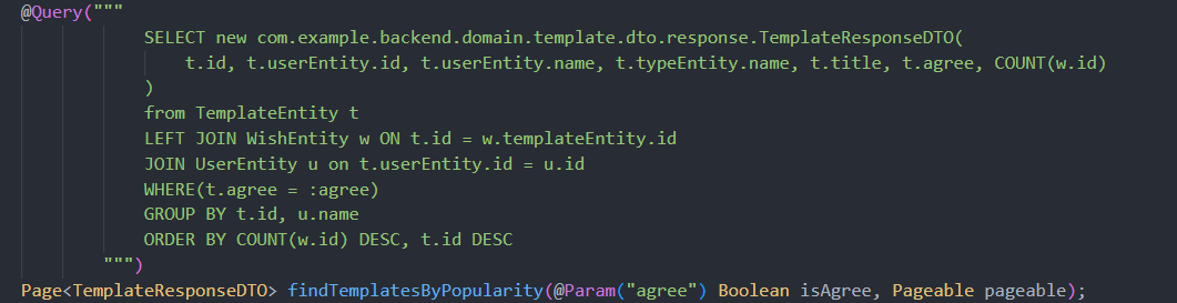 템플릿 인기순으로 정렬 후, Template 정보와 찜하기 개수를 가져오고 싶었다.