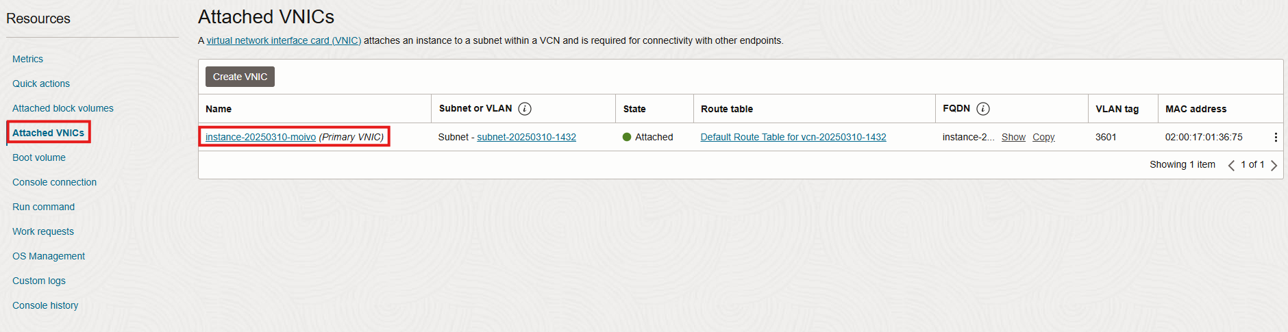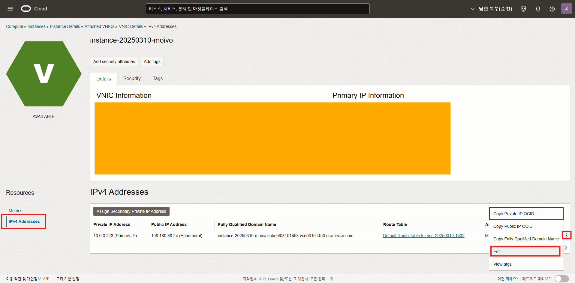 화면 내려서 VNIC 클릭하여 방금 만든 인스턴스 클릭