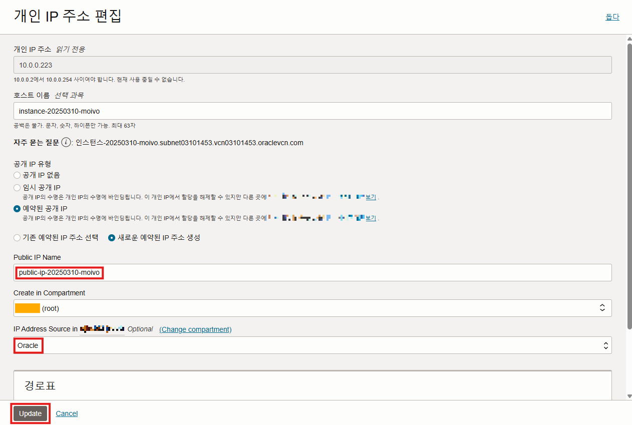 다시 설정으로 들어가서 '예약된 공개 IP -> 새로운 예약된 IP주소로 생성'으로 변경