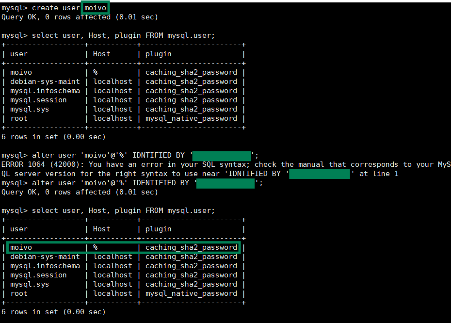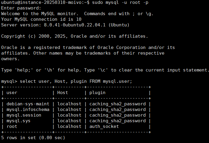 테이블에서 'auth_socket'로 되어 있는 것을 ' mysql_native_password'로 변경하면서 비밀번호 설정을 해줘야 한다.