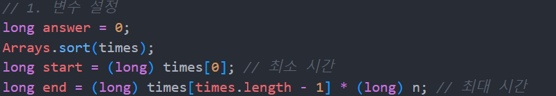 while문 조건(start가 end보다 커질때까지 반복)을 통해서 최소 시간을 구함