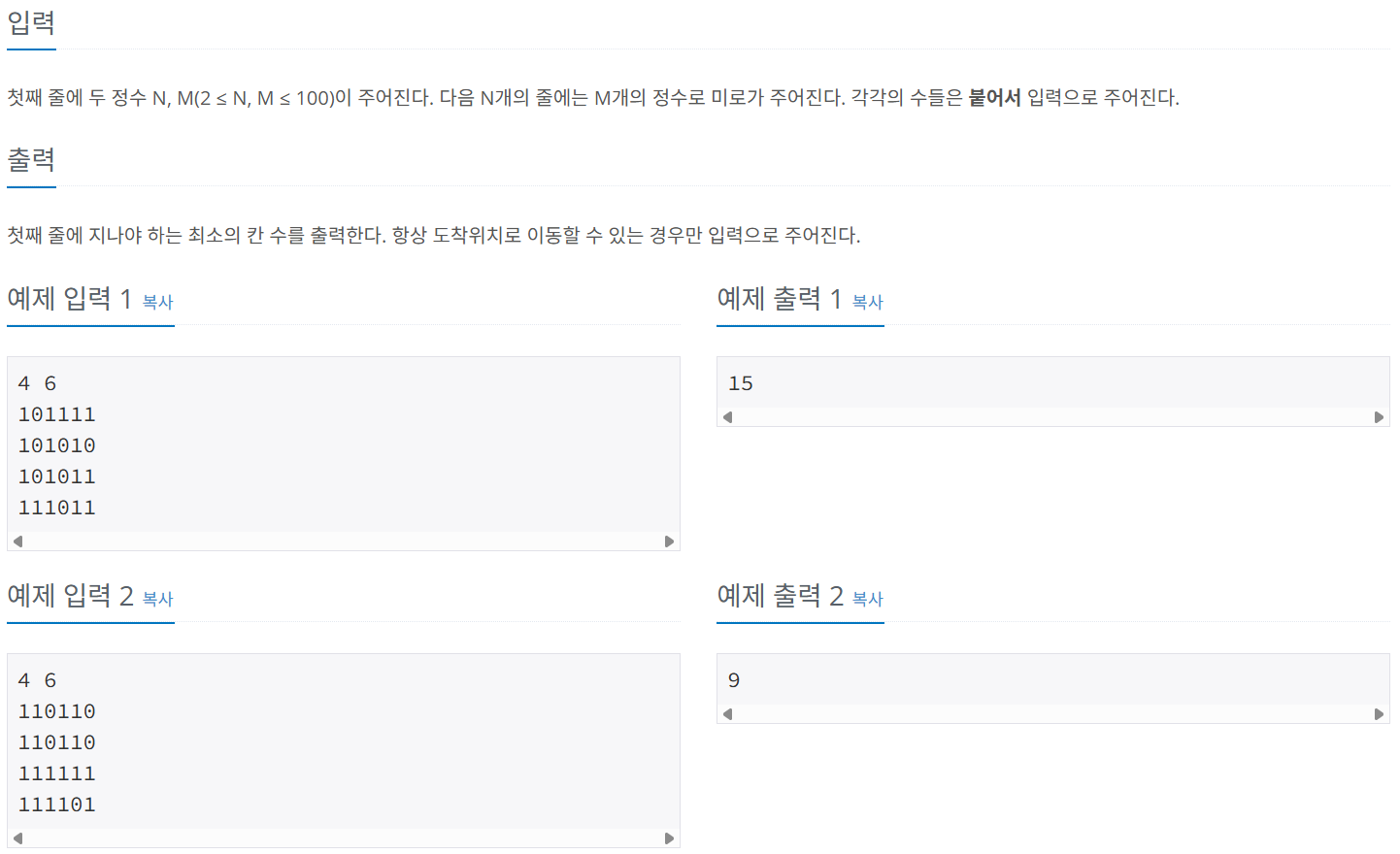 미로에서 1은 이동할 수 있는 칸을 나타내고, 0은 이동할 수 없는 칸을 나타낸다. 이러한 미로가 주어졌을 때, (1, 1)에서 출발하여 (N, M)의 위치로 이동할 때 지나야 하는 최소의 칸 수를 구하는 프로그램을 작성하시오. 한 칸에서 다른 칸으로 이동할 때, 서로 인접한 칸으로만 이동할 수 있다.