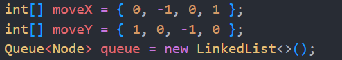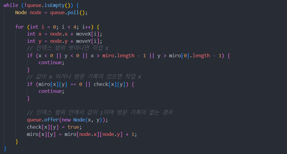 위의 조건 1,2에 해당하지 않을 경우에만 이동할 수 있는 칸이라고 판단하며 큐에 해당 값을 저장한다. 또한, check 배열에 방문했다는 의미로 true값을 저장한다. miro 배열에는 여태까지 이동한 값에 1을 더해 이동한 칸의 수를 저장한다.