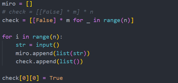 check 변수는 처음에 [[False] * m] * n으로 선언했더니 원하지 않는 결과가 나왔다. check[0][0] = True 를 수행하면 모든 check[i][0] 값이 True로 변경되었다.