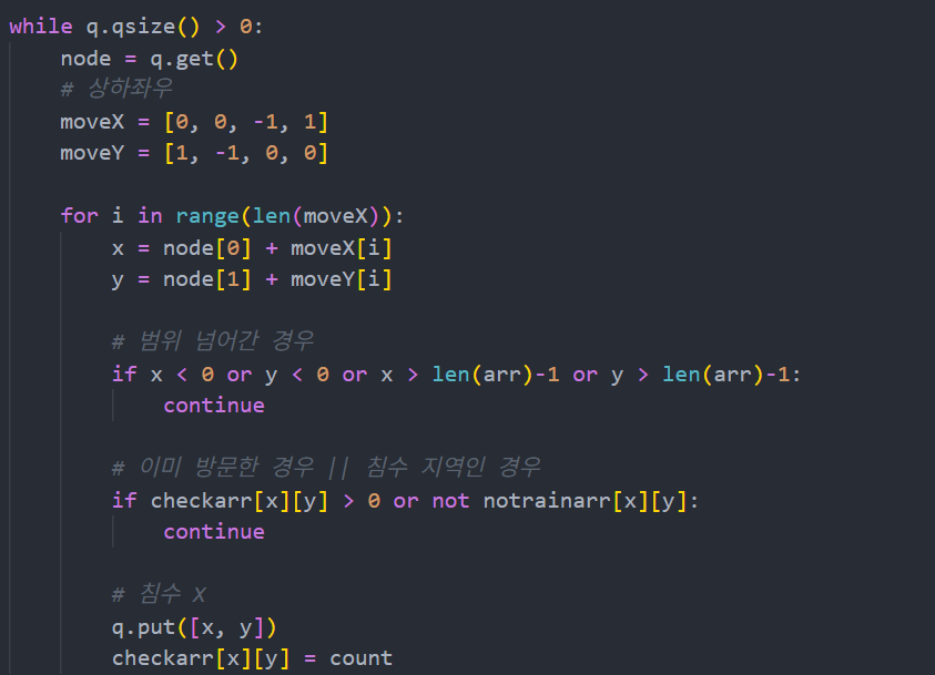 안전영역을 담고 있는 큐를 가지고 반복문을 돌린다.