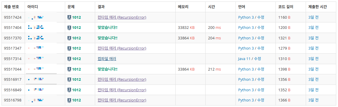 하지만 여전히 sys.setrecursionlimit 없으면 런타임 에러 발생한다. 그래서 다른 사람의 제출 코드를 확인해보니 큐를 사용한것을 알 수 있었다...