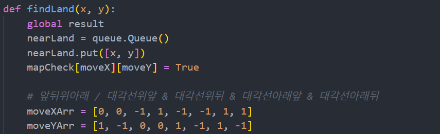 해당 함수에서는 매개변수로 주어진 x,y 노드를 기준으로 8방향의 노드를 확인한다. 위에서 언급했다 싶이 BFS로 판단하여 큐를 사용했다.
