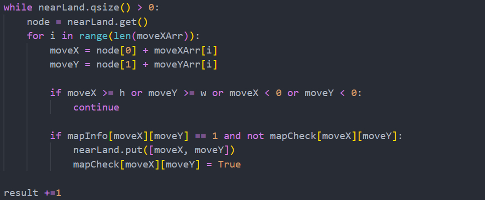 이제 해당 노드가 각 방향에 있는 노드가 아직 미방문이면서 Land인지 확인한다. 조건에 충족하면 방문 체크와 큐에 해당 노드를 저장했다.