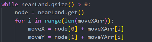 큐에 저장된 모든 노드를 확인하기 위해 큐에 원소가 존재할 때까지 반복 수행한다. 방향값을 저장한 위의 배열을 기준으로 움직일 노드의 x, y값을 구한다.