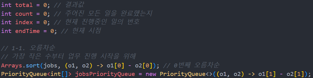 하지만 PriorityQueue에 저장하기에 2개 이상의 작업(배열)을 가지고 있어도 2번째 원소인 소요시간에 따라 오름차순 정렬이 된다.