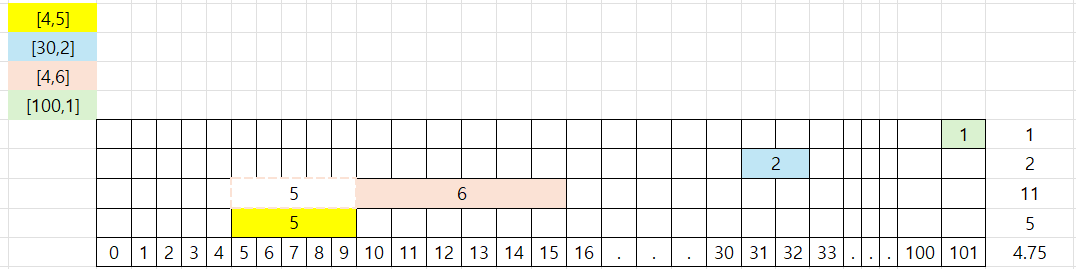 예시 : { { 4, 5 }, { 30, 2 }, { 4, 6 }, { 100, 1 } }