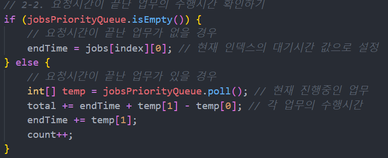 while문을 통해 현재시점보다 요청시간이 작거나 같은 작업을 큐에 저장한다.