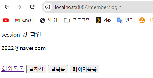 session 값 확인 : <p th:text="${session.loginEmail}"></p>