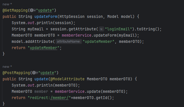 2. memberService의 update 함수 호출하여 회원정보 수정