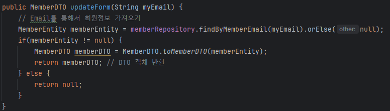 4. 반환 값 : findById 함수의 반환 값이 MemberDTO 객체