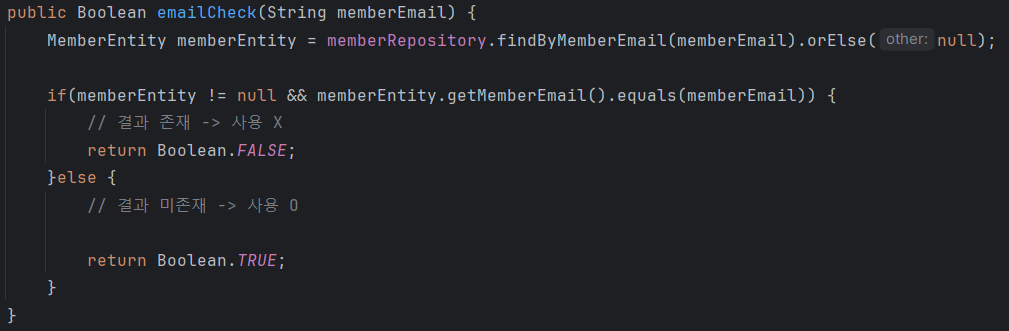 - memberService의 emailCheck 함수 호출하여 동일한 email이 존재하는지 확인