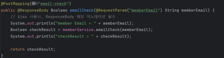 1. 클라이언트 측에서 받아온 memberEmail 데이터를 매개변수 memberEmail로 받음
