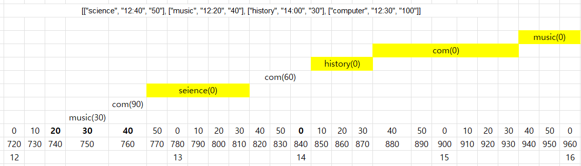 위의 사진은 예제 2번을 가지고 과제 수행을 표로 표현해 봤다. ()안의 숫자는 남은 시간이며 노란색은 완료한 과제이다.
