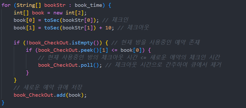 위의 for문을 통해서 큐에는 방을 사용하고 있는 예약정보를 담고 있음.