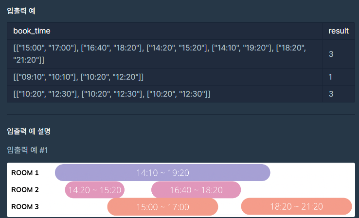 예약 시각이 문자열 형태로 담긴 2차원 배열 book_time이 매개변수로 주어집니다.