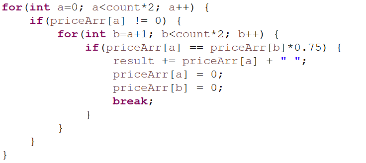 할인된 가격과 그에따른 정상가격을 찾으면 배열의 해당 원소들을 0으로 저장하고 할인된 가격을 result 변수에 저장한다.